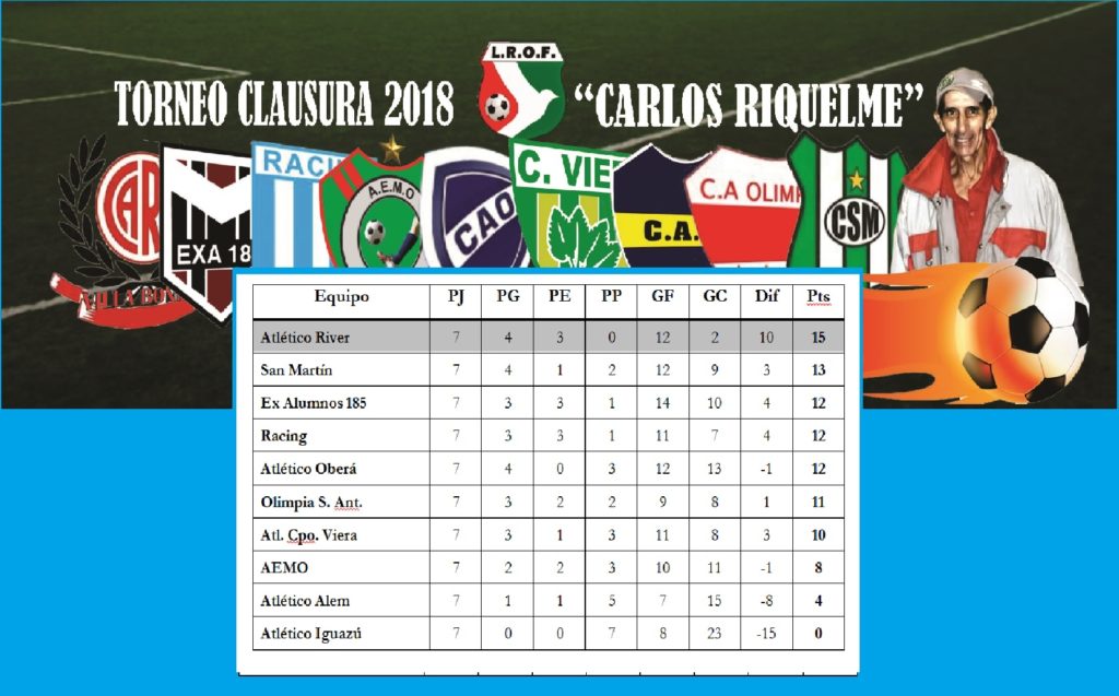 La penúltima fecha (8a) que se juega este domingo tiene aparejado el camino hacia la clasificación a la siguiente ronda del Torneo Clausura 2018 “Carlos Riquelme” de la Liga Regional Obereña de Fútbol. A dos fechas de culminar con la etapa clasificatoria, los equipos que quieren avanzar a la siguiente etapa, querrán ganar para obtener cierta ventaja deportiva. Algunos pelean por el primer lugar, que clasifica directamente a Semifinales, otros solo aspiran a clasificar.
