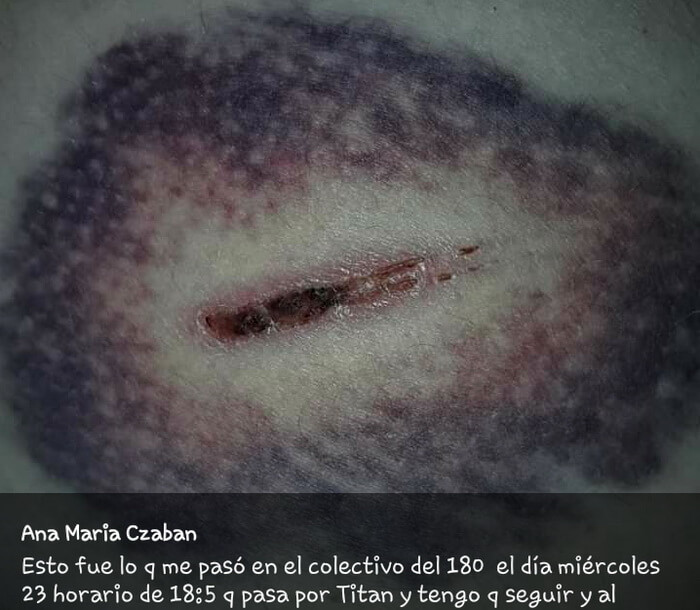 En la red social Facebook, Ana Maria Czaban mostró la lesión que sufrió cuando se lastimó con el soporte de la cortina del transporte urbano de pasajeros y solicitó que los concejales controlen las unidades.