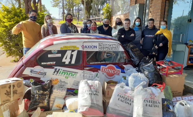 El piloto solidario Gastón Dalarda, junto al grupo de trabajo integrado por Nacho Recalde, Aníbal Valiente, entre otros, entregaron ayer las donaciones que se juntaron el fin de semana pasado en la cuarta fecha del Misionero de Pista al Meredero Analía Krujoski de Oberá.