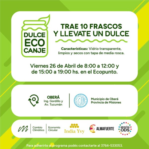 El municipio de Oberá se sumará a la primera jornada de intercambio del programa provincial «Dulce Eco Canje». Este programa tiene como objetivo promover el uso eficiente de frascos de vidrio post consumo y su reutilización. La actividad se llevará a cabo el viernes 26 de abril en el Ecopunto de la Plaza Malvinas, ubicado en Av. Tucumán y calle Ingeniero Gordillo, de 8 a 11 de la mañana y de 2 a 5 de la tarde.