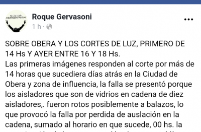 El diputado Renovador, Roque Gervasoni, en su cuenta de Facebook, denuncio que los cortes de energía en la línea 132 que está entre Roca ... -