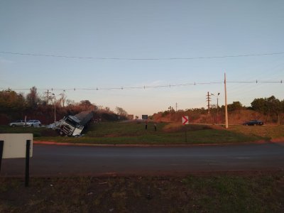 Esta mañana, en la Ruta Nacional 14 y Picada Sarmiento, por causas que se tratan de establecer, un camión Volvo, de Brasil, conducido por ... -