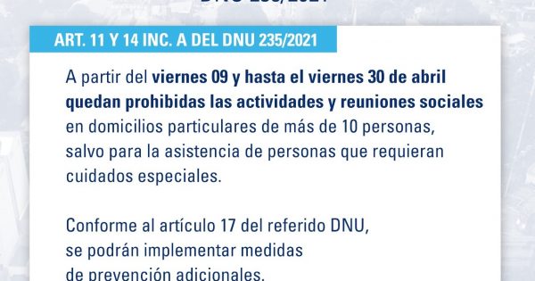 El Gobierno de la Ciudad de Oberá, adhiere al Decreto de Necesidad y Urgencia (DNU), el mismo establece que partir del día de la fecha y hasta el día viernes 30 de abril quedan prohibidas las actividades y reuniones sociales en domicilios particulares de más de 10 personas, salvo para la asistencia de personas que ... -